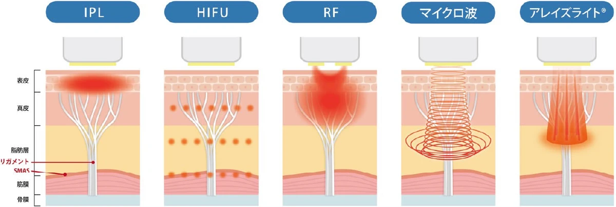 780-850nmの近赤外線の領域のマゼンダ光線を照射することで真皮と皮下組織上層部にアレイズライトがアプローチしコラーゲンの生成が促進されます。
