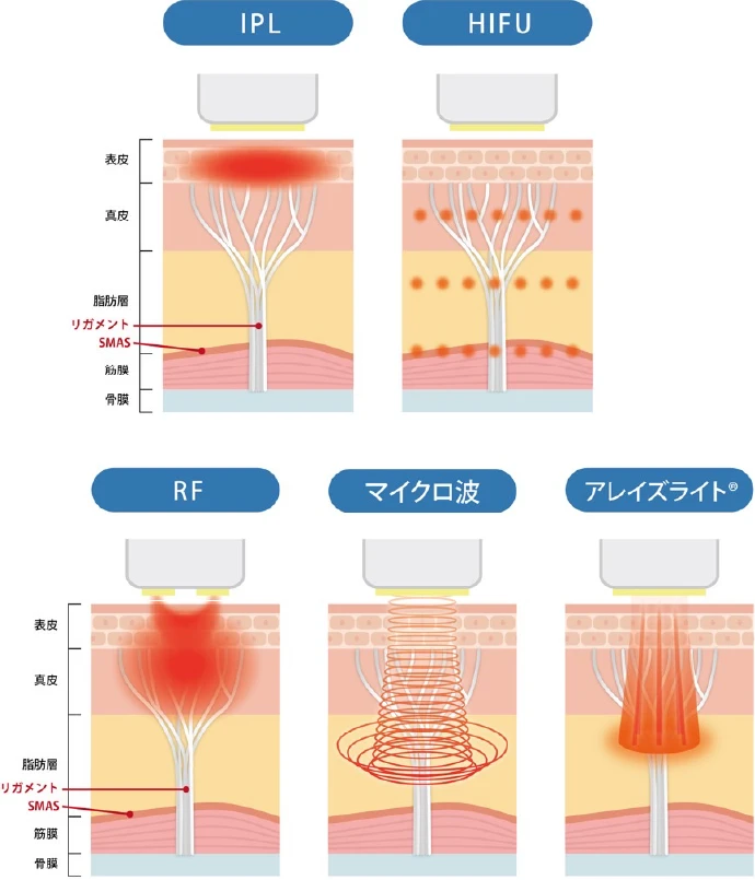 真皮~脂肪層上部にエネルギーを集中的に届け、肌の下層組織を引き締めることでリフトアップ効果が期待できます。